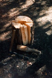 Shown are the board shingles that I have rived out of Loblolly Pine and the froes and mallet used for riving. The average thickness of the shingles is between 1/4 and 3/8". I actually got some shingles 18" wide by riving across the grain. Notice the pile of "hearts" obtained from the wood. These shingles have been on the shed for over 10 years and are still sound.